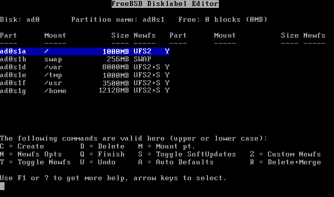 我们在使用 /stand/sysinstall 新增一个分割区时,您会发现在 Newfs 字段中,除了 / 及 swap 外,其它的分割区 newfs 字段都有一个 UFS2+S 的设定,如图 9-1 所示: