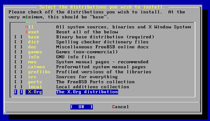 在安装 FreeBSD 时,我们应该己经选择要安装 X Windows 套件,如果您安装 FreeBSD 时并未安装该套件,您可以在开机后执行 sysinstall 来进入安装时的选单。进入安装画面后,选择 [Configure]->[Distributions]->[X.Org],如图 11-1 所示。