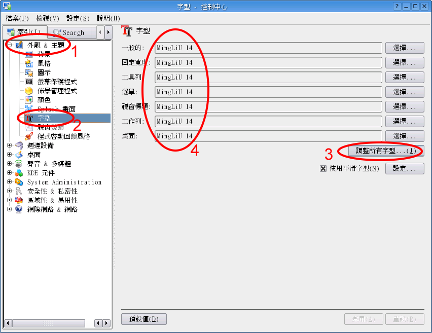 进入 KDE 后,您可以在控制中心里调整字型,建议您先将所有字型调为细明体 (MingLiu)。如果您要调整字型,请按画面左下角的 K 图示,并选择「控制中心」,即出现下列画面: