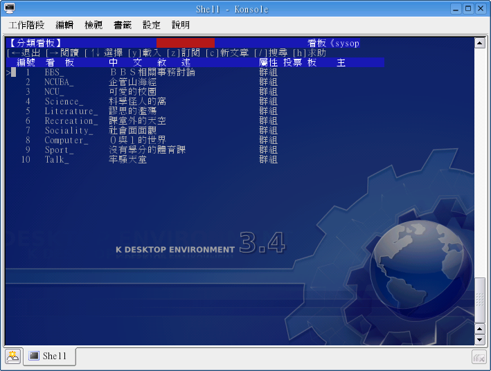 KDE 所附的终端机 Konsole 已经支持中文的显示,而且还有许多强大的功能。例如我们可以设定终端机背景、字型等,而且操作十分容易。只要您在 ~/.xinitrc 中有设定 LANG 为为 zh_TW.Big5 即可显示中文。