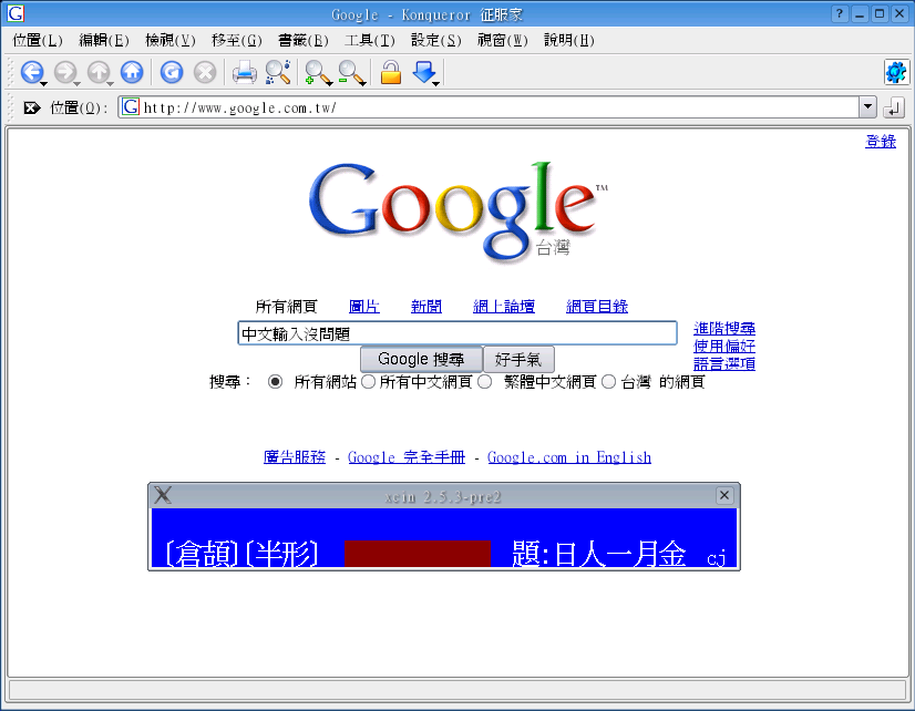 修改完后存盘,接着进入 X Window 您将看到输入法的窗口,然后我们就可以执行支持其它软件来输入中文了。例如我们开启 Konsole 的窗口后,就可以使用 Ctrl+Space 来切换中英文输入法。其它像 Konqueror 或 Kword 下的中文输入也没问题,如 下图。