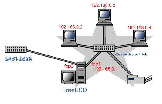 这里我们假设使用二张网络卡,一张是对外的网卡,代号是 fxp0;另一张是对内的网卡,代号 fxp1。以下的设定中请依您的网卡代号来加以修改。当然,你也可以只使用一张网络卡,将所有的计算机及对外网络都接在一台 HUB 上,再利用 alias 的功能将一张网卡设定二个 IP。在开始前,请先参考「网络设定」一章中的说明设定好第一张对外的网络卡喔。