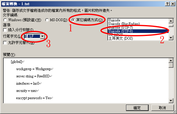 您必须特别注意的是,由于 Samba 3.0 支持 Unicode (UTF-8),如果您要将共享数据夹名称设定为中文,请使用支持 UTF-8 的文书编辑器来编辑 smb.conf,并在存盘时将档案存成 UTF-8 的纯文字格式。Windows 支持 UTF-8 的文书编辑器如 Word、UltraEdit、EmEditor,在存盘时,必须使用 UNIX 的换行格式。以 Word 为例,在存盘时,我们将档案存成纯文字文件 (txt),接下来会出现下列选单: