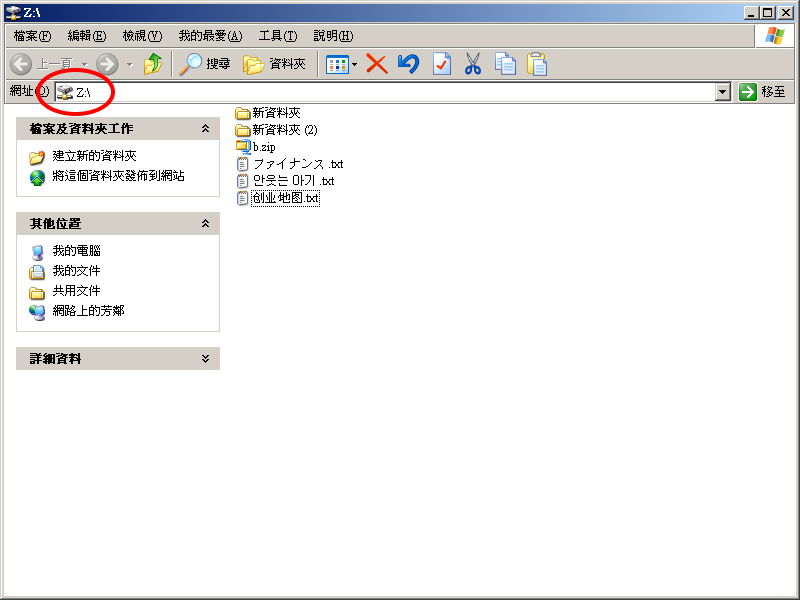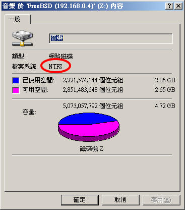 我们可以使用 Windows 的联机网络磁盘驱动器功能,将一个共享数据夹变成系统中的网络硬盘。例如,将共享数据夹变成 Z: 磁盘驱动器。如果您点选该网络磁盘驱动器,并查看内容,您会看到它的档案系统格式为 NTFS,如下图所示:
