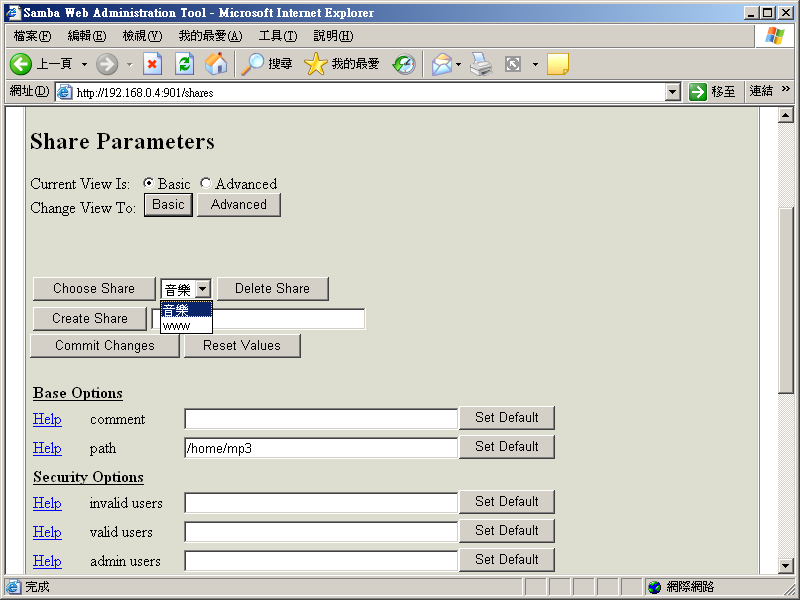 然后就可以使用浏览器以 port 901 连到 Samba Server了。假设 Samba 的 ip 是 192.168.0.1,则输入 http://192.168.0.1:901,被要求输入账号密码时,请输入 root 及 root 在系统中的密码。请注意 root 一定要有密码,否则无法登入。接着出现下列画面:
