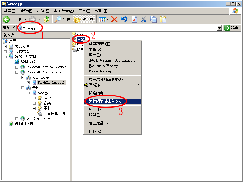 将分享的资料夹挂入后,我们就可以使用 FreeBSD 档案处理的指令,诸如 cp、mv 等来抓取我们所要的档案,就像是从本机硬盘中使用档案一样。