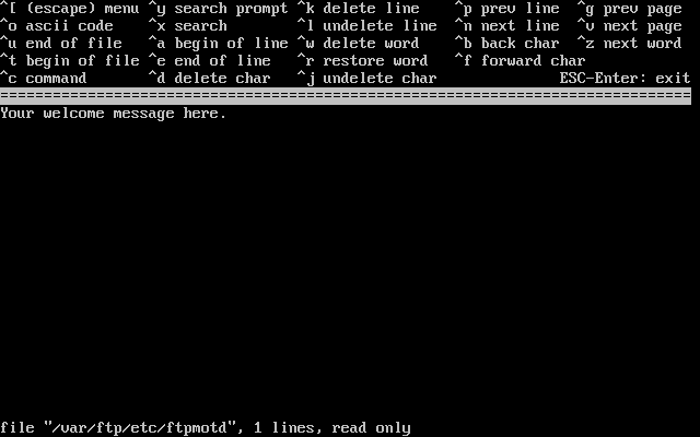 如果您选择 并按下 Enter键, 系统会自动打开文本编辑器让您编辑FTP的欢迎信息。