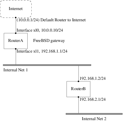 在这里,RouterA 是我们的 FreeBSD 机子,它充当连接到互联网其它部分的路由器的角色。 默认路由设置为10.0.0.1, 它就允许与外界连接。我们假定已经正确配置了 RouterB,并且知道如何连接到想去的任何地方。 (在这个图里很简单。只须在 RouterB 上增加默认路由,使用 192.168.1.1 做为网关。)