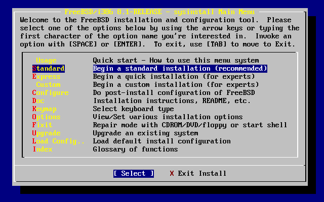 sysinstall 是 FreeBSD 项目所提供的安装程序。它以 console(控制台)为主, 分为多个菜单及画面让您配置及控制安装过程。