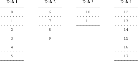 磁盘的负载平衡很大程度依赖于驱动器上数据的共享方式. 在下面的讨论中, 将磁盘存储想象成一个巨大的数据扇区,像一本书的页 那样用编号来设定地址. 最明显的方法是把虚拟磁盘分成许多连续的扇区组, 每个扇区大小就是独立的磁盘大小,用这种方法来存储数据, 就像把一本厚厚的书分成很多小的章节。 这个方法叫做 串联 它有一个优点就是磁盘不需要有任何特定的大小关系。 当访问到的虚拟磁盘根据它的地址空间来分布的时候, 它能工作得很好。 当访问集中在一个比较小的区域的时候,性能的提高没有显著的改进。 图 22-1 举例说明了用串联组织的方式来分配存储单元的顺序。