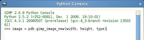 Python-Fu is not limited to just calling procedures from the PDB (GIMP procedural database). To create a new image object like in the example above, you can also type