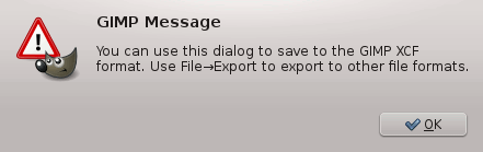 The command saves your image to disk. With GIMP-2.8, this command saves in XCF format only. If you try to save to a format other than XCF, you get an error message: