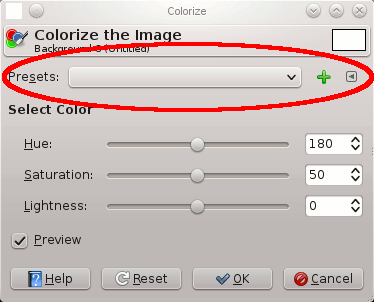 Except Desaturate and Posterize, color tools have presets: saved tool settings that you can retrieve later.