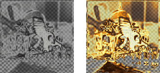 For both layers the color balance is modified (according to Highlight balance and Chrome balance), increasing the amount of red, green, and blue, with emphasis on highlights.
